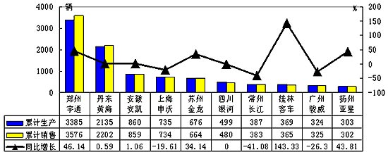 2005年1-8月大客整车主要企业累计产销量及销量同比增长率