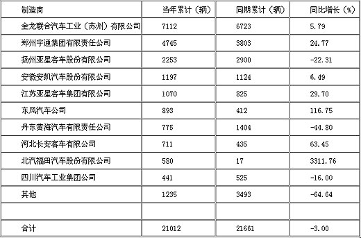 2005年1-12月份,全国共生产中型客车21012辆,同比下降3.00%。其中,前十名中型客车制造商的产量达到19777辆,占中型客车总产量的94.12%。