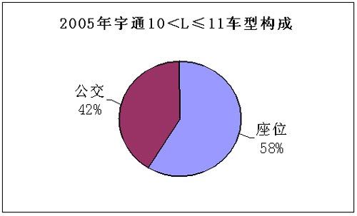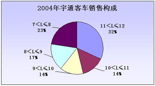 从车型长度来看,11米以上客车和9-10米客车的销量比重有所下降,而10-11米客车和9米以下客车的销售比重有所增加,9-10米客车结构的变化与整个行业的结构变基本一致,10-11米客车和8-9米客车正是宇通公司2004年陆续推出的新产品所发挥作用的结果。