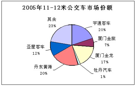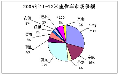 2005年10-11米座位车销售为5235辆,宇通客车占据了市场份额的1/3强,其次为厦门金旅客车、无锡太湖客车、丹东黄海客车和苏州金龙客车,市场销售份额分别为13%、12%、10%和5%。前5家企业的市场销售集中度高达76%。宇通客车的市场优势十分明显。