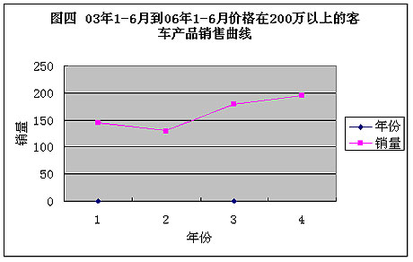 2) 03年1-6月到06年1-6月,对价格在150-200万的销售情况分析:此区间的销量从03年的159辆逐渐减少到116辆,呈现逐渐下降趋势。但下降的量都不大。04年比03年减少10辆,同比下降6.28%,05年比04年减少31辆,同比下降了20.8%。下降的幅度明显加大;06年比 05年减少了2辆,同比下降了1.69%,下降的幅度明显减小。这说明高端客车产品在150-200万这个价格区间的市场容量并不大,尽管这几年各主流厂家都推出了13米7的特大型客车产品,但销量很少,且真正在这个价格段的产品也不多,因此出现这种情况在预料之中。