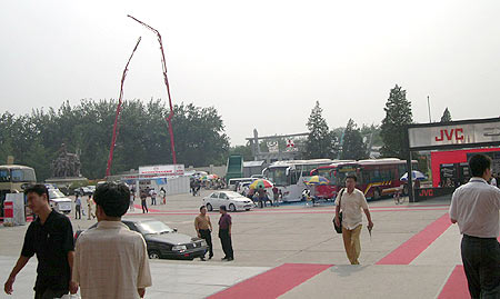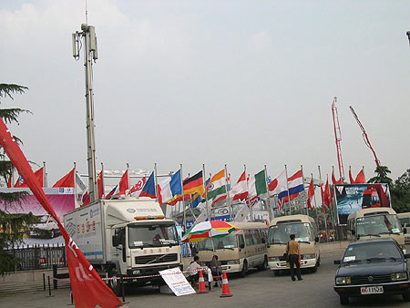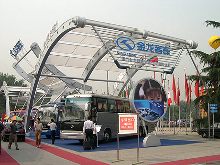 农展馆大门北侧第一个展位上停着四辆金龙客车,近300平方米的展位上,几乎没有观众,礼仪小姐在遮阳伞下显得很孤独。记者走上前去一打听,才知道这次只来了厦门金龙一家,而苏州金龙等其他金龙旗下的厂商并没有参加。提起此次车展把展位设在农展馆,金龙的一位工作人员表示,比起前几次车展,此次效果不如从前。由于在农展馆展出的车都是客车和一些专业的汽车设备等配套产品,所以来此的观众人气不是很旺展位又设置在露天,好多人也不愿意在骄阳下欣赏这些车辆。