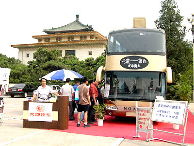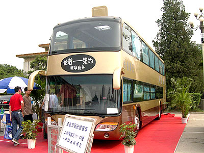 两层的客车在北京已经司空见惯,但专门拿出一层来娱乐休闲的客车还十分罕见。记者昨天在农展馆发现了一辆号称“长途霸王”的诺亚客车,这辆车的一层不但设有吸烟和娱乐区,还有一个洗手间、贮存间和饮料专柜,而二层才供乘客乘坐。据诺亚汽车负责人介绍,该车售价188万,目前只有四川境内有5辆在试运营,八九月份还要生产10辆,而即将生产的这10辆客车已经被澳门预定。