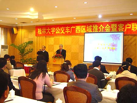 会上,桂林大宇销售人员和技术人员通过多媒体文件演示和实物展示,让与会的领导亲身感受到了桂林大宇 GDW6105G 新型公交车的魅力,他们一致认为桂林大宇公交车在性能和车内的人性化设计上都比目前在广西区内各城市在用的公交车先进,将是未来城市公交市场上受欢迎的产品。桂林大宇领导和技术人员还虚心听取了与会领导的宝贵意见,这些意见对于桂林大宇今后改进公交车产品,满足客户需求,有着重要的作用。