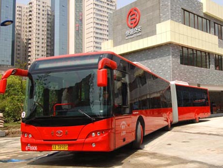 4月20日,长度为18米可载员160人的新型客车从快速公交起点站出发。