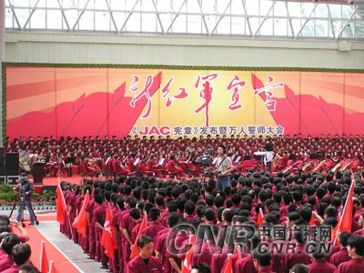 5月27日,安徽合肥国际会展中心,红旗、红装汇成火红的海洋,安徽江淮汽车集团公司在这里隆重举行JAC宪章发布会暨万人誓师大会,进一步激发了一万多名员工新一轮的创业热情,标志着JAC的文化和战略发展跨入历史的新纪元,同时展示了这只在市场经济中拼搏的新红军队伍学习创新的精神和魅力。