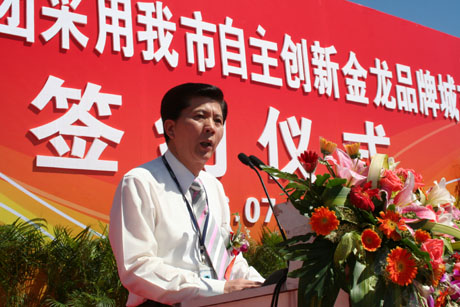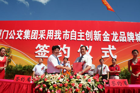 7月13日,"厦门公交集团批量订购金龙客车签约仪式"在厦门金龙联合汽车工业有限公司(大金龙)灌南新厂区隆重举行,仪式上厦门市公交集团与大金龙双方共同签订了共计350辆公交车的购销合同,来自厦门市政府、厦门市公交集团及大金龙公司的领导共同出席了签约仪式并发表了讲话。