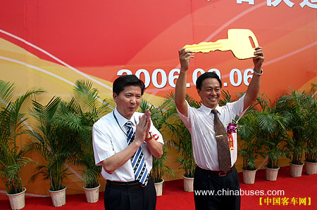大金龙总经理江世煌先生将金钥匙郑重交给公交集团总经理郑顺先生
