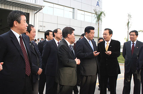 图为中共中央政治局常委、全国政协主席贾庆林(前排中间)参观大金龙生产车间。福建省委书记卢展工(前排左二),省委常委、厦门市委书记何立峰(前排左一),厦门金龙汽车集团股份有限公司董事长叶天捷(前排右二),厦门金龙联合汽车工业有限公司总经理江世煌等人陪同参观(前排右一)。