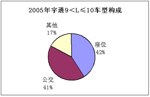 2005年宇通客车的市场份额达到了19%(5米以上客车市场),其中,11米以上客车占到了该市场份额的30%,10-11米客车和8-9米客车的市场份额均为22%,9-10米和7-8米客车的市场份额分别为17%和18%,6-7米和5-6米客车所占市场份额较小,分别为9%和5%。由此可见,在7米以上的车型中,宇通客车在市场同类车型中具有大致1/5-1/4的市场份额。