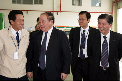 图为中国机械工业联合会副会长、中国汽车工程学会理事长张小虞(左二)莅临参观指导大金龙。大金龙总经理江世煌(右一)、大金龙副总徐向东(右二)、大金龙总经理助理林闽雄(左一)陪同。