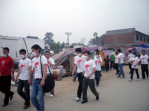 我们此次到绵竹九龙镇所运送的人员中有35名医护人员,前来接替已经在那里连续工作2天的一批唐山医疗队的医护人员。另外25人为志愿者,负责搬运食品给这些医疗人员等。与我们随行的还有来自北京《汽车商业评论》的三名记者。我们在给医疗队发放物资的时候,四川省电视台正在现场采访这些医疗人员,对于在现场同样忙碌的宇通救援队,四川电视台的记者也详细的了解了我们的工作情况。在那里,我们还遇到一批人民解放军空军部队,他们手上都拿着铁锹,我们询问后才得知,他们是在搜寻废墟中的尸体,避免时间过长引起瘟疫,出于安全的考虑,他们婉拒了我们参与搜寻工作的请求。