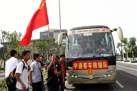18日上午8时45分,宇通救援队又接到任务,将40余名来自西藏自治区、河南和河北等地的志愿人员送到成都市120急救中心,并帮助将药品装车。半个小时内宇通我们就赶到了现场,此时成都的气温在30度以上,身着迷彩服的40名志愿者衣服都来不及脱,就立即投入到了药品装车行动中去。在装车现场,我们还发现几位河南老乡,他们是来自洛阳和三门峡等地的志愿人员,其中有人还是自己一个人自费来到成都报名参加救援的。另外还有目前在四川外语学院就读大三的一位志愿者,当天是周日没有课,他就叫上几位洛阳和三门峡等地的河南籍同乡,一起加入到了志愿者的行列中。