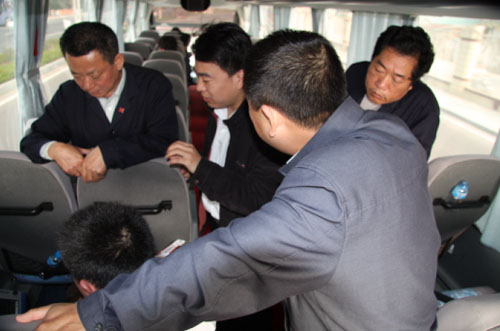 比赛就要开始了,六位选手一起在ZK6127H"神行剑"合影留念,自信的笑容洋溢在每个人的脸上,这种自信更多的来自对自己高超技艺和宇通发动机热管理系统神奇节油效果的信任。