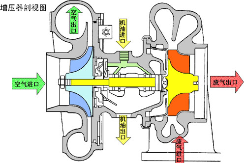 涡轮增压器实际上是一种空气压缩机,通过压缩空气来增加进气量。它是利用发动机排出的废气惯性冲力来推动涡轮室内的涡轮,涡轮又带动同轴的叶轮,叶轮压送由空气滤清器管道送来的空气,使之增压进入汽缸。当发动机转速增快,废气排出速度与涡轮转速也同步增快,叶轮就压缩更多的空气进入汽缸,空气的压力和密度增大可以燃烧更多的燃料,相应增加燃料量和调整一下发动机的转速,就可以增加发动机的输出功率了。