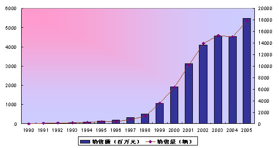 1990年5辆,126万元 -- 2005年17,847辆,54.74亿元