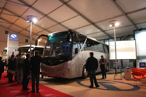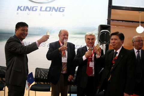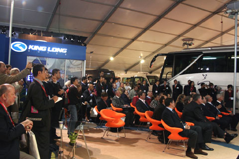 BUS AND COACH LEADER(中国客车领导品牌)"的新闻发布会,前来参加发布会的有来自比利时、德国、英国、巴西、瑞典等国家和地区的40多家海外媒体以及国内《中国汽车报》、《中国交通报》、《中国江南网页版》、《商用汽车》杂志等媒体的新闻记者,世界客车联盟秘书长LUC先生应邀出席,而大金龙方面,总经理江世煌、负责海外市场的总经理助理张万益、副总工程师周方明及欧洲市场顾问克瑞斯以及来自德国、英国、意大利、法国、瑞典、澳大利亚的六家代理商代表汇聚一堂,共同亮相。
