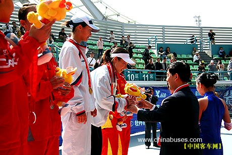 陆昕董事长为第十届全运会网球比赛女子双打冠军晏紫/郑洁颁奖
