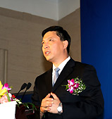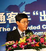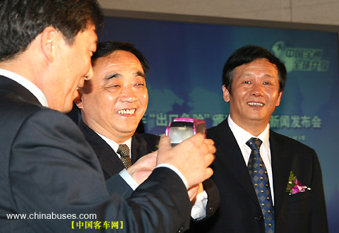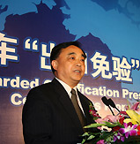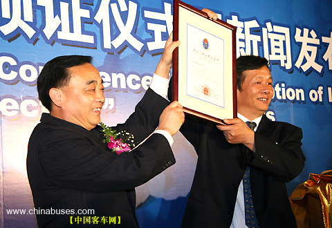 | 国家质量监督检验检疫总局副局长葛志荣郑重地将一块"金字招牌"--"进出口商品免验证书",交到了郑州宇通集团总裁汤玉祥手上 |
