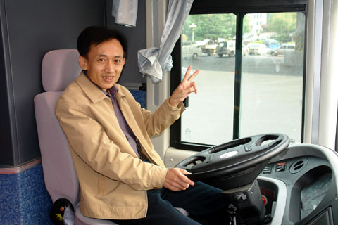 采访期间,他和我们一起试乘了"神行剑",他也向宇通技术工程师询问了发动机热管理系统在节能降耗上的具体情况,当得知辽宁虎跃安装该系统前后每百公里油耗节省将近3升时,他不禁竖起大拇指,连连称赞该系统在节油耗上的优异表现。试乘之后,刘按捺不住内心的激动,又仔细观赏了"神行剑"与"逍遥剑"。最后,他走到"神行剑"的驾驶窗,手握方向盘,过了一把"车长瘾"。