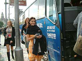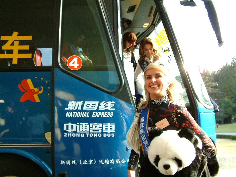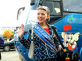 中国江南网页版讯:11月16日下午,参加世姐赛的110位佳丽抵沪,负责在上海接待的第三组中通客车停在机场外,早已称为媒体关注的焦点.