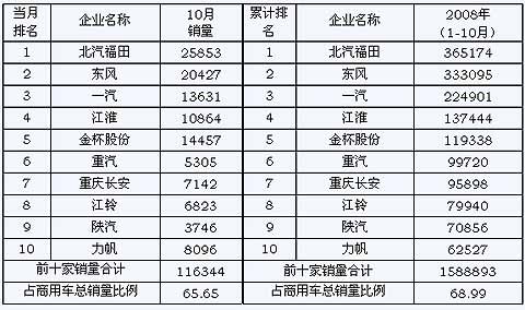 受宏观经济环境影响,国内不少中小企业相继倒闭,这一状况直接影响到了10月份商用车销量,与9月相比,10月除客车非完整车辆产销呈较快增长,其它商用车品种均呈现不同程度下降。其中客车产销1.79万辆和1.85万辆,环比下降23.28%和18.26%,同比增长1.54%和1.05%。