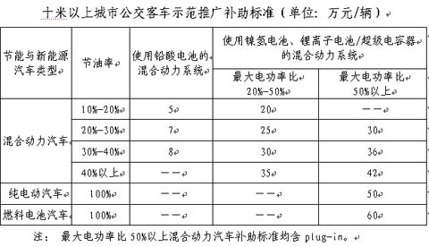 第九条 补助标准主要依据节能与新能源汽车与同类传统汽车的基础差价,并适当考虑规模效应、技术进步等因素确定。公共服务用乘用车和轻型商用车示范推广具体补助标准见附表一,城市公交客车示范推广具体补助标准见附表二,特种车辆补助标准参照上述补助标准确定。