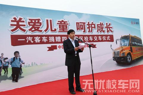 一汽集团成都事业部党委书记王琳致辞,一汽作为作为国有特大央企,坚持践行社会责任。继前次捐赠55辆坤程皮卡和20辆解放J6L支持灾区重建,这次由一汽客车公司精心制造了6辆校车捐助给震区学校使用。这批校车是一汽客车历时3年自主研发的精品,秉承了一汽"品质、技术、创新"的品牌内涵和"争第一、创新业、担责任"的价值理念,严格按照美国校车的制造标准,完全满足了《国标》校车的技术标准,安全性能远远超过普通公共汽车。