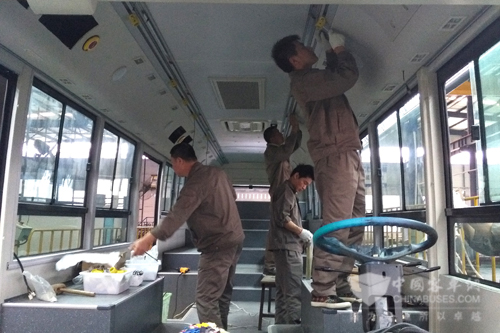 工人们正在组装电动客车