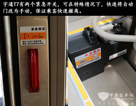 与其他竞品车型形成鲜明对比的是,T7的排气管收到了车身下且抬高了离地高度,这缩小了排气管磕碰到异物的几率。另外,T7在工作人员专座的上方有个拉手,遇到紧急情况时,可以将其拉开,车门便由自动切换为手动,能让车内人尽快撤离。