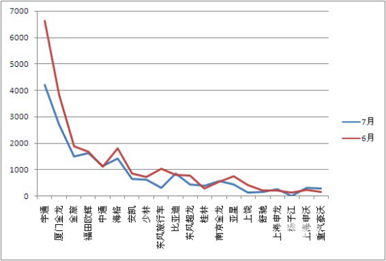 相比2016年6月24961辆的销量,7月份客车销量下降了近24%。见下图,宇通客车销量下滑较为明显。