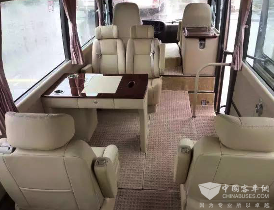 康恩迪内饰设计出色,处处均彰显了人性化。其不仅配备了高性能的冷暖空调、乘客阅读灯,还提供了更为开阔的乘坐空间。泰山景区此次订购的是改装版车型,内饰布局上进行了调整,空间开阔,整体设计极具人性化,并流露出高端奢华的尊贵气质。车内有车载冰箱,办公桌,桌上安有抽屉、纸巾盒、两个杯座等,能够满足高端游客的办公或休闲需求。