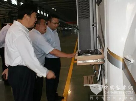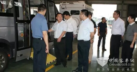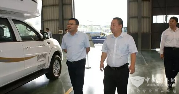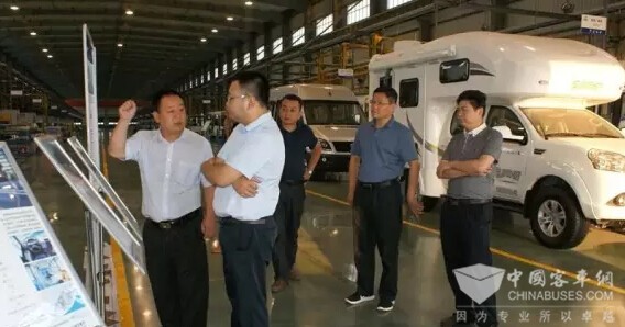黄强一行先后来到安源客车产品展区和总装车间,参观了安源客车最新研发的低地板内循环电动车、自行式和拖挂式房车、纯电动城市公交客车、冷链物流车、校车等产品,详细察看和了解各款安源产品的内部设施和性能。