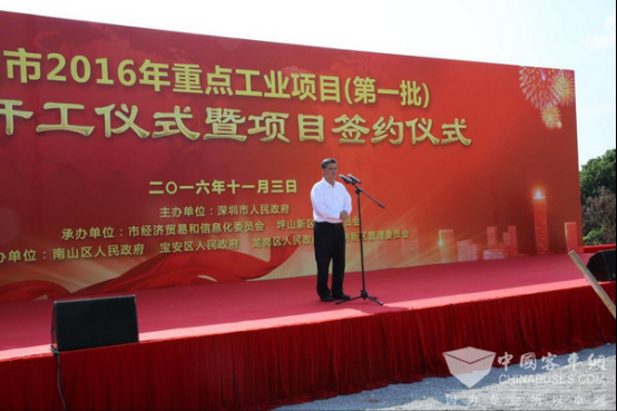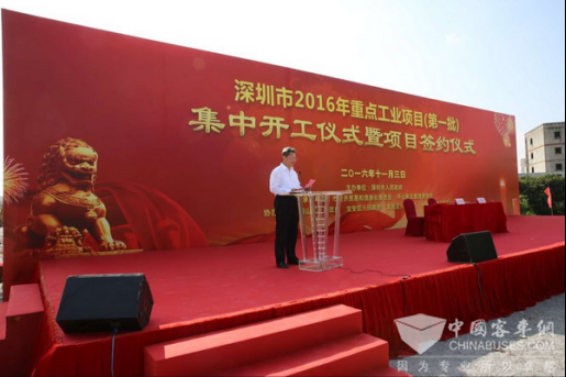 仪式上深圳市副市长陈彪表示深圳市非常欢迎南京金龙来到深圳 ,并对南京金龙坪山新能源汽车与零部件基地项目开工奠基表示祝贺。深圳是中国改革开放建立的第一个经济特区,是中国改革开放的窗口,创造了举世瞩目的“深圳速度”。为了统筹区域协调发展,振兴粤东西北地区,深圳推出了“东进战略”,2016年是深圳市全面实施“东进战略”的第一年。创维系新能源汽车产业入驻深圳东部——坪山新区,将助推深圳成为世界新能源汽车之都,也将带动东部地区的产业发展。