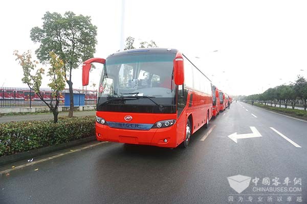 德刚客运购买的批量海格红色大巴顺势而为 通勤大巴红似火