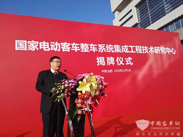 安徽省科技厅高新处处长王学雷和安凯客车董事长戴茂方共同为“国家电动客车整车系统集成工程技术研究中心”进行揭牌。安凯客车总经理查保应致辞,并宣读工程中心第二届专家委员会名单。安徽省科技厅、国内新能源领域权威专家学者、省内高校、公交运营企业、各大新闻媒体等各界代表共同出席揭牌仪式,隆重庆祝电动客车领域的标志性事件!
