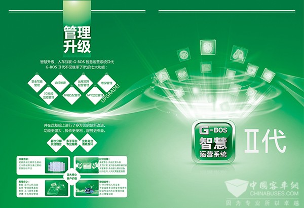 2010年,苏州金龙推出G-BOS智慧运营系统,率先利用互联网技术助力道路客运企业的安全管理和节能减排工作。在交通运输部举办的全国道路客运“海格智慧”科技助力行动中,通过G-BOS管理,80%以上影响安全驾驶的不良驾驶行为指标得到明显改善,车辆百公里油耗平均降低5%。目前G-BOS装配车辆已突破8万辆,按每车每年平均运行10万公里,百公里油耗20升,平均百公里节油5%来计算,安装G-BOS的车辆每年能节约8千万升柴油,可减少二氧化碳排放超2万吨。