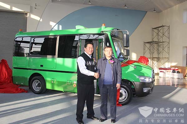 天津创研科技产业园投资有限公司董事长李宏和安凯客车总经理查保应在新车前合影