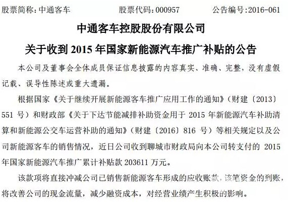 中通客车2016年12月12日午间公告,根据国家《关于继续开展新能源客车推广应用工作的通知》(财建〔2013〕551号)和财政部《关于下达节能减排补助资金用于2015年新能源汽车补助清算和新能源公交车运营补助的通知》(财建〔2016〕816 号)等相关规定以及公司新能源客车的销售情况,公司于近日收到聊城市财政局向公司转支付的2015年国家新能源汽车推广累计补贴款20.36亿元。