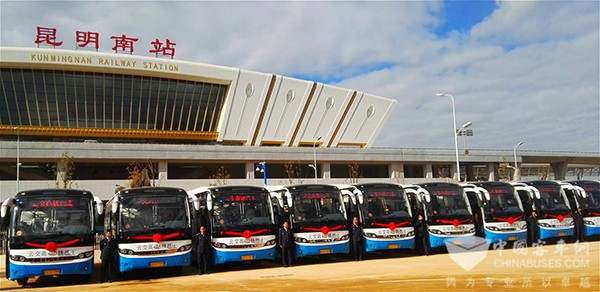 当24台苏州金龙海格KLQ6115客车组成的“云交高铁巴士”车队精神抖擞在昆明高铁南站精彩亮相,立即吸引了广场上乘客的注意。大家纷纷驻足观看,他们表示这真是一件民心工程,坐高铁出行,再也不用倒车,可以一站直达了。