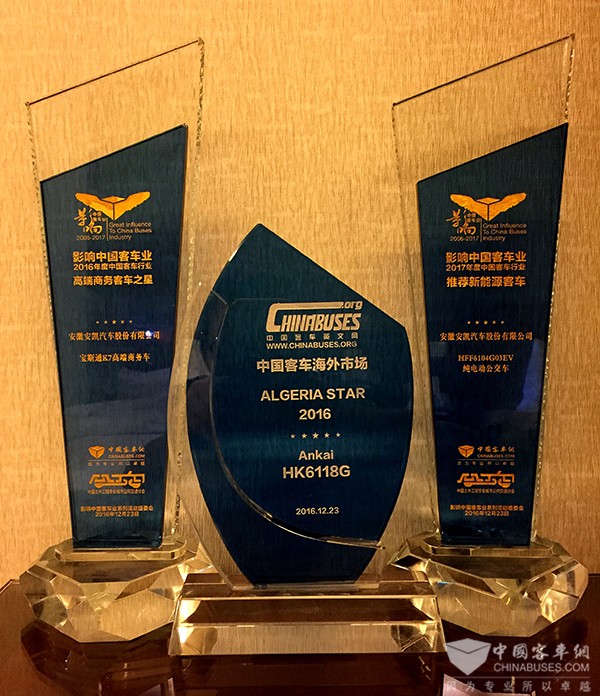 据了解,本次安凯所获得的三个奖项分别是:安凯宝斯通K7——“2016年度高端商务客车之星”称号,安凯HFF6104G03EV纯电动公交车——“2017年度推荐新能源客车”称号,安凯HK6118G——“2016年度中国客车阿尔及利亚之星”称号。