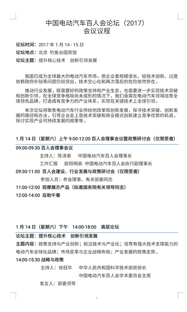 中国电动汽车百人会论坛(2017)发言嘉宾名单正式公布