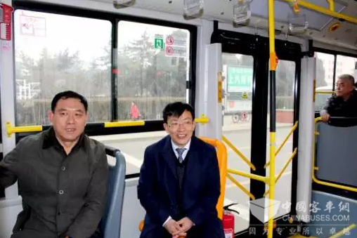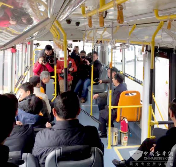 上线仪式上,中车时代电动董事长申宇翔为与会领导及来宾介绍了长治公交C10的优势与特点,并邀请大家试乘体验。坐上崭新的C10,长治副市长陈鹏飞和长治公交董事长王小钧一边查看车内细节,一边高兴地为新车点赞。