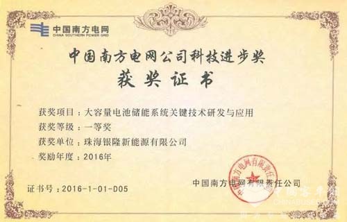 银隆新能源参与完成的863课题“大容量电池储能系统关键技术研发与应用”项目喜获2016年广东省科技二等奖,银隆新能源作为项目参与方喜获2016年度中国南方电网公司科技进步一等奖。