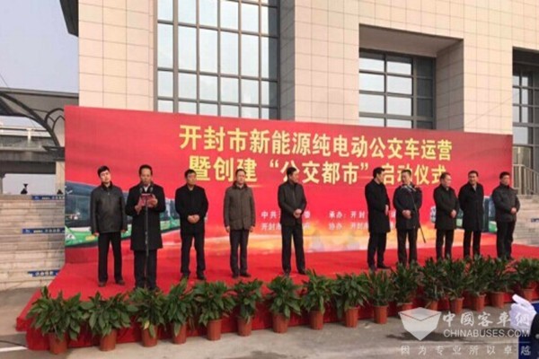 610辆新能源纯电动公交车运营暨“公交都市”创建活动启动仪式现场2017年2月3日,河南省开封市610辆新能源纯电动公交车运营暨“公交都市”创建活动启动仪式在宋城路站举行,这次更新也是宇通客车规模最大的一次新能源公交车政府采购。截至目前,开封市已更新新能源车辆760多辆,占全市全部公交车辆的93.6%,远高于公交都市新能源车辆占30%的比例标准。