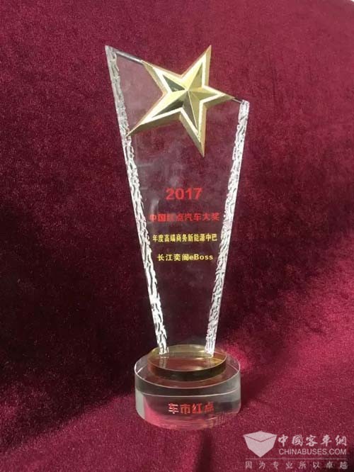 2017年2月18日,“2017中国汽车发展论坛暨首届中国红点汽车大奖颁奖盛典”在京举行。长江汽车纯电动中巴“奕阁(eBoss)”以卓越的性能及2016年新上市以来不菲的市场表现,赢得“年度高端商务新能源中巴”荣誉。