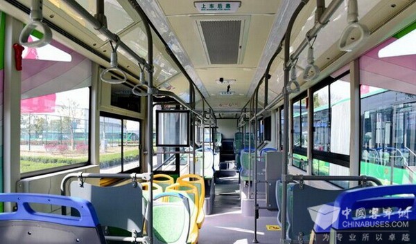 公交车侧窗设计有防紫外线玻璃,车内设置USB接口,可为智能手机、平板电脑等智能移动设备充电。车内LCD屏,使得数字及画面显示更加清晰和细腻柔和。车内设置轮椅区、母婴区,一级踏步高度控制在330mm以内,真正的“低入口”,方便乘客上下车。