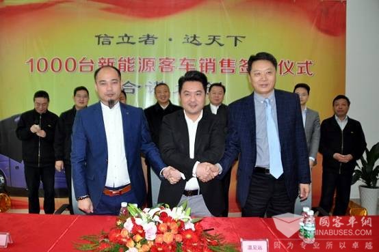 3月28日上午,博能上饶客车有限公司与苏州埃威特集团、上海丁氏集团在上饶举行“1000辆新能源客车销售签约仪式”。博能控股集团副总裁、上饶客车公司总经理温见远,苏州埃威特集团董事长王松,上海丁氏集团董事长丁洪兵在协议书上签字。标志着上饶新能源客车夺得建厂历史首个单项大单,也刷新了今年新能源客车行业订单记录。