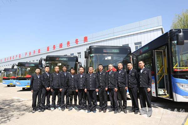 宣化公交司机与福田欧辉BJ6105混合动力公交车合影