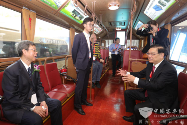 交通运输部科学研究院院长石宝林(左一),中国智能交通协会理事长、原科技部副部长吴忠泽(右一)参观银隆仿古铛铛车